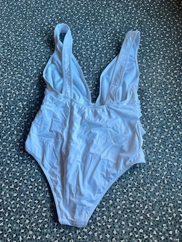 Stunning ASOS white ruched swimsuit. Perfect for hen parties, pool parties, beach clubs or holidays. Designed with a deep plunge neckline, ruched waist and high leg cut to elongate. Crafted from lightweight, stretchy fabric for a flattering fit.