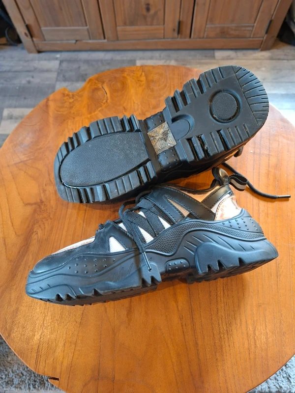 These platform style sneakers by ASOS feature a chunky trainer look with a rose gold metallic detail. They are designed with a comfortable lace-up closure and have a small scuff mark on the inside of the metallic section.