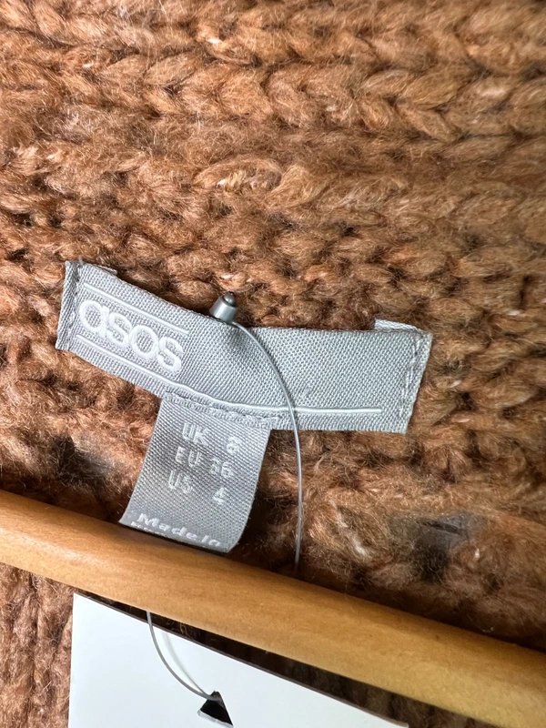 The ASOS Brown Chunky Cardigan Boho Crochet is available in sizes S.