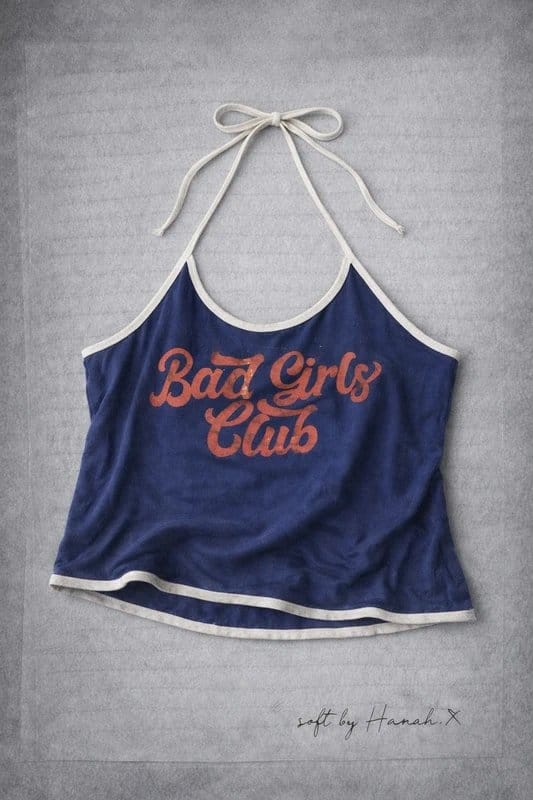 This ASOS 'Bad Girls Club' halter top in UK 18 features a navy base with cream contrast trim. The bold red slogan print adds a striking element, while the halter tie neckline and relaxed, oversized fit create a perfect effortless street Y2K vibe.