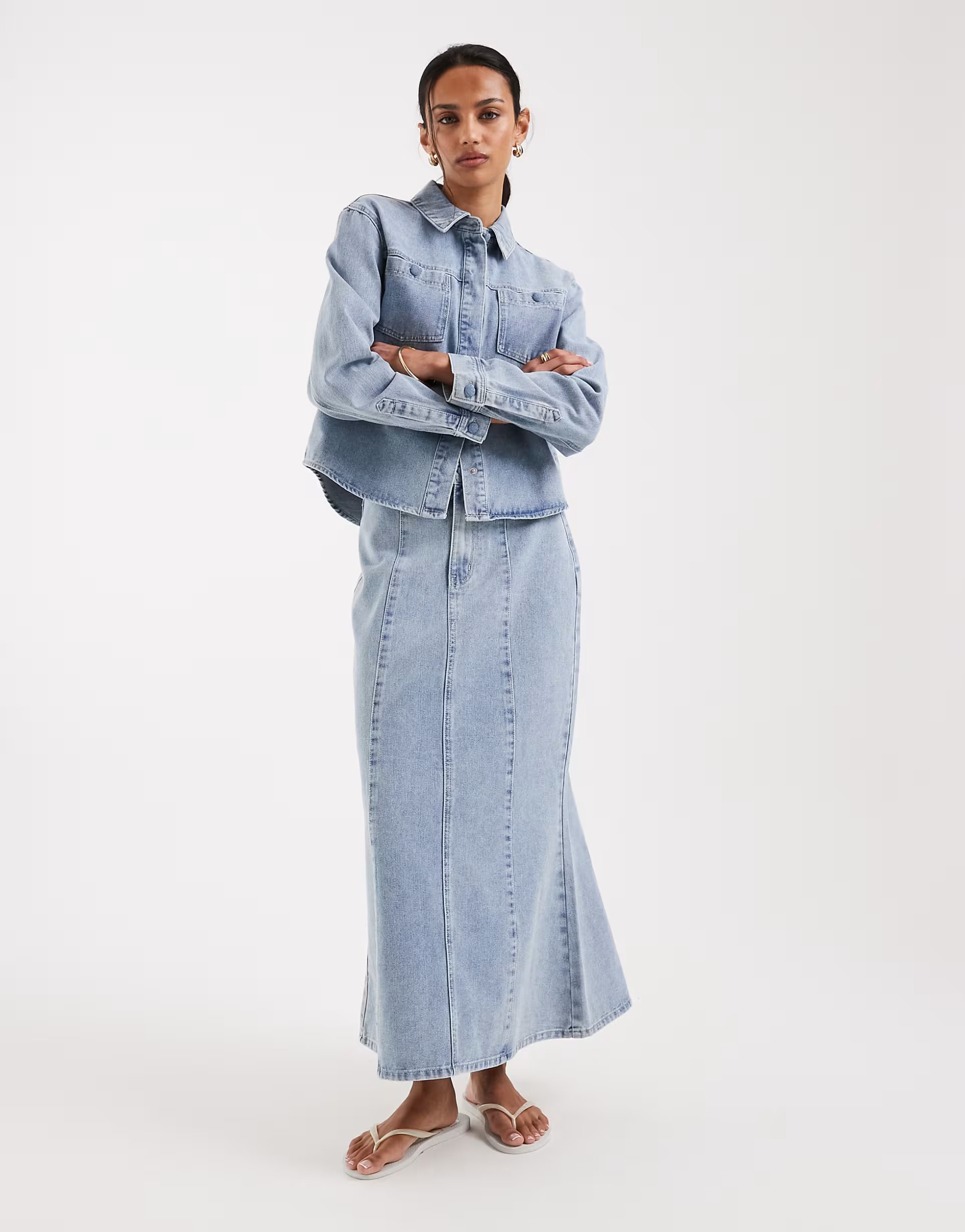 The ASOS AWARE Light Blue Denim Ankle Skirt Co-ord is ideal for casual.
