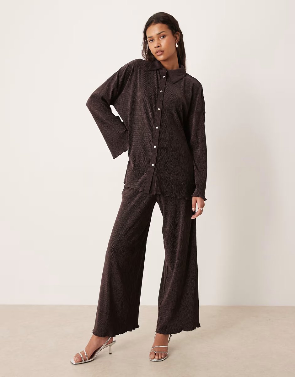 The AWARE Chocolate Velvet Plisse Wide Sleeve Shirt and Wide Leg Trouser Set is ideal for party, evening, formal.