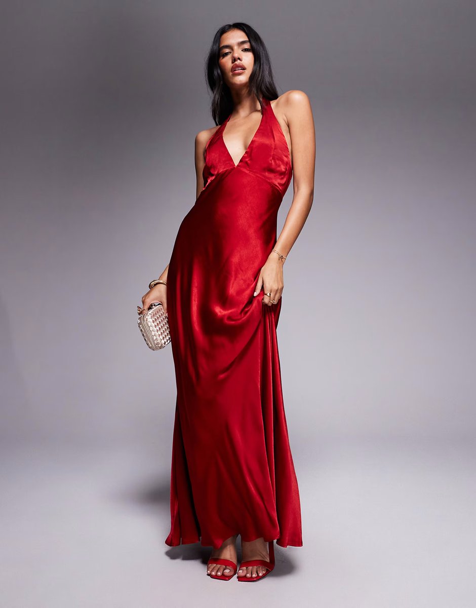 The Bardot Magdalene Satin Halter Dress in Deep Red is ideal for formal, wedding-guest, evening.