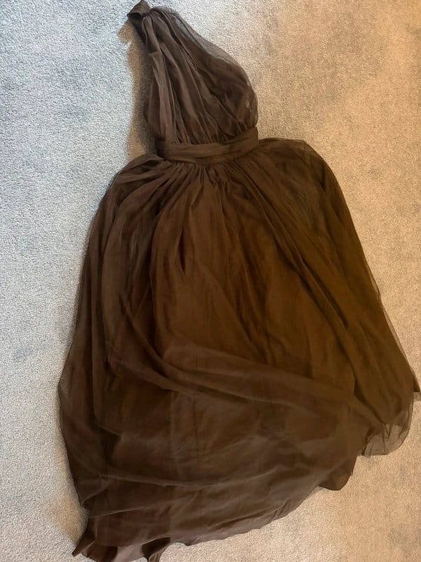 This black tulle ball dress from ASOS features a full-length silhouette with a flowing, layered tulle design. Ideal for evening events or special occasions.