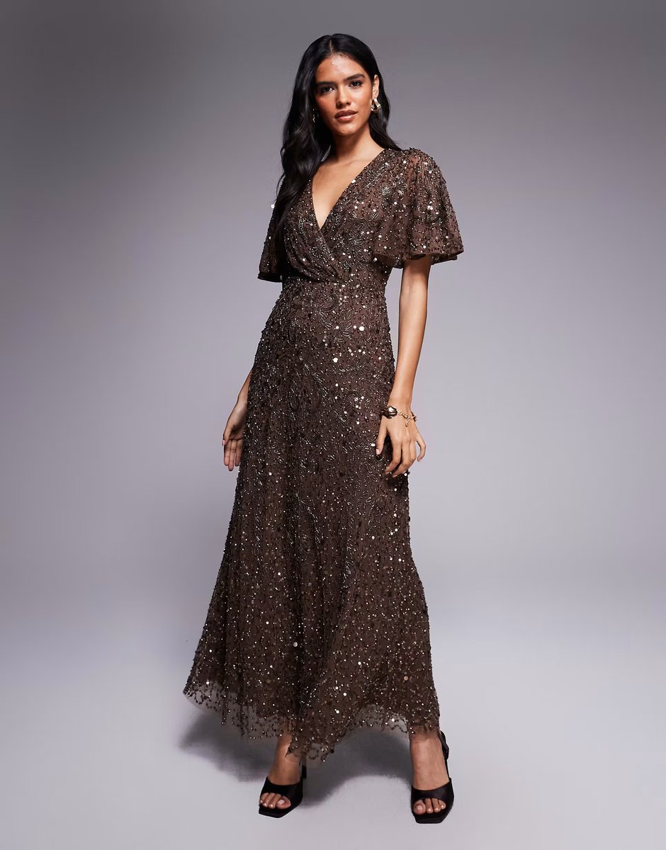 The ASOS Beauut Embellished V Wrap Maxi Dress in Chocolate Brown is ideal for evening, formal, party.
