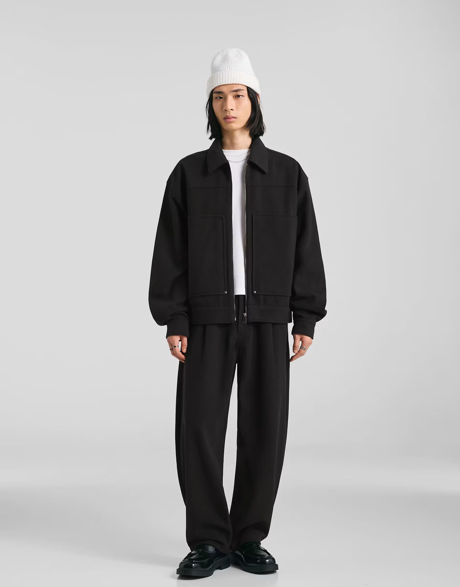 The Bershka Balloon-fit flannel trousers in black are designed for a relaxed yet stylish look. Crafted with a balloon-fit silhouette, these trousers feature a button and zip closure for a secure fit.