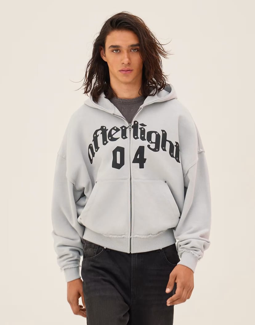 The ASOS Boxy Zip-Up Print Sweatshirt in Light Grey is available in sizes XXXL, XXL, XL, XS, L, M, S.