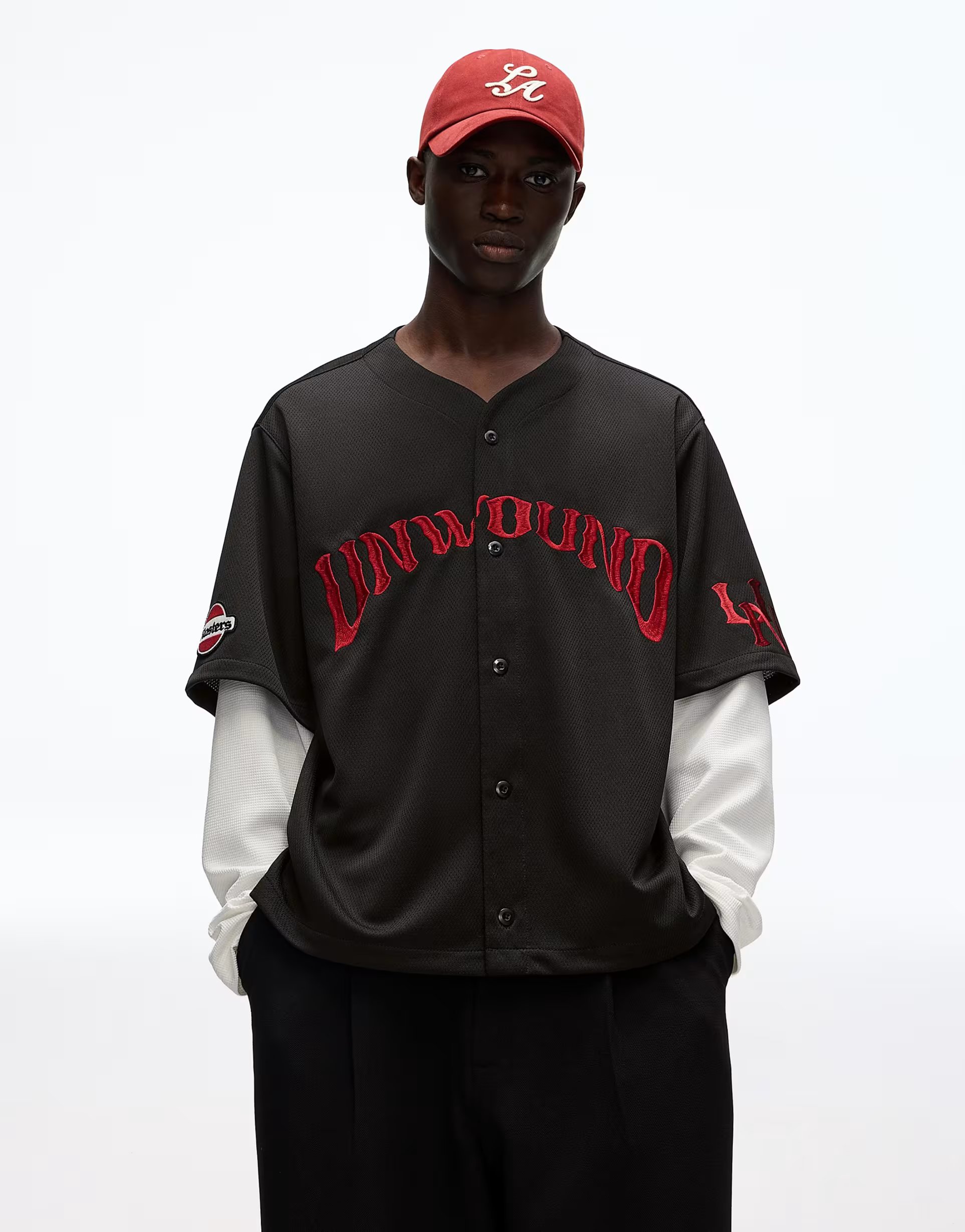 This boxy shirt features embroidery on the front with a double sleeve design, perfect for a casual look. The black color adds a sleek, versatile touch.