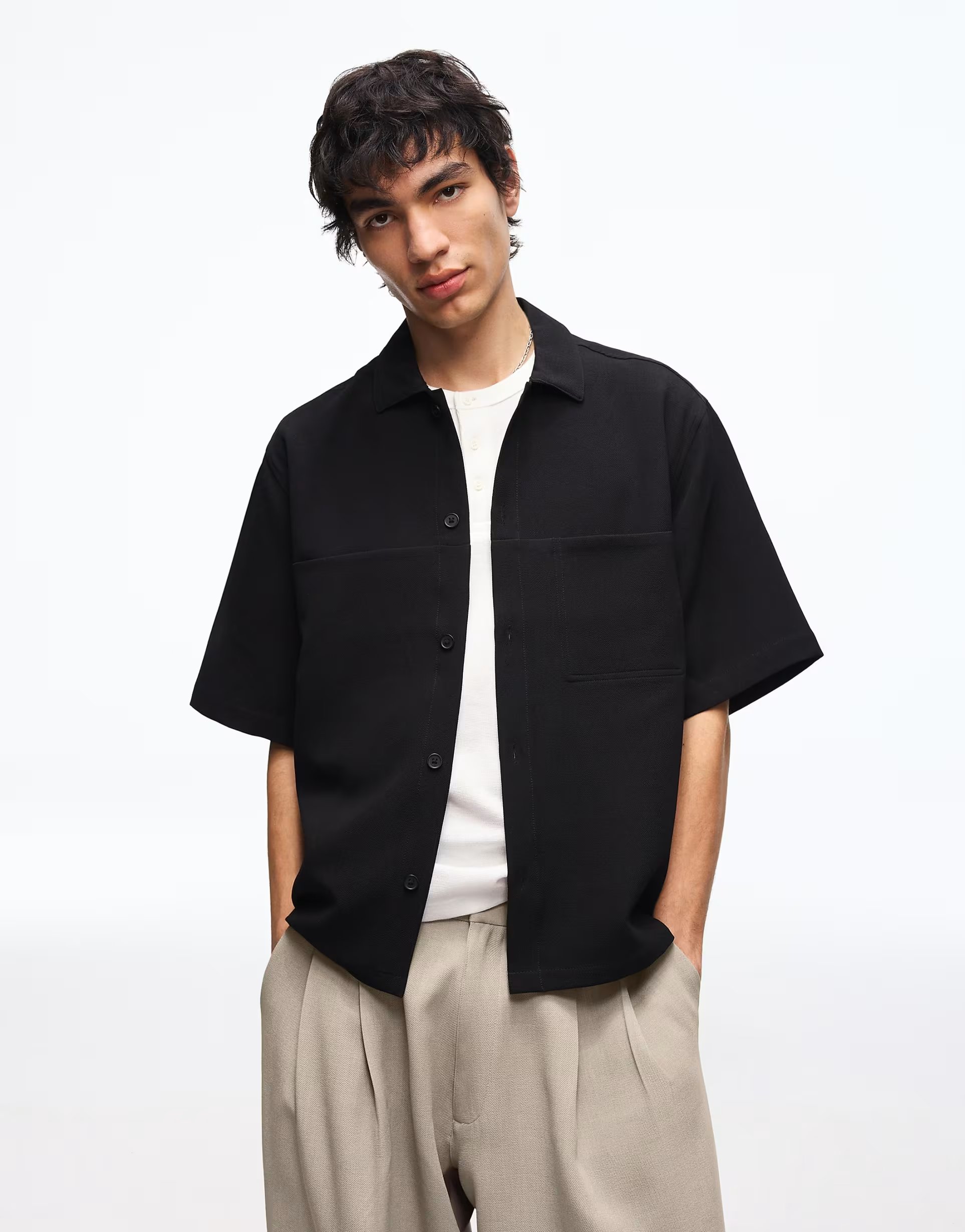 The ASOS Boxy Tailored Fit Short Sleeve Shirt in Black is ideal for casual, smart-casual.