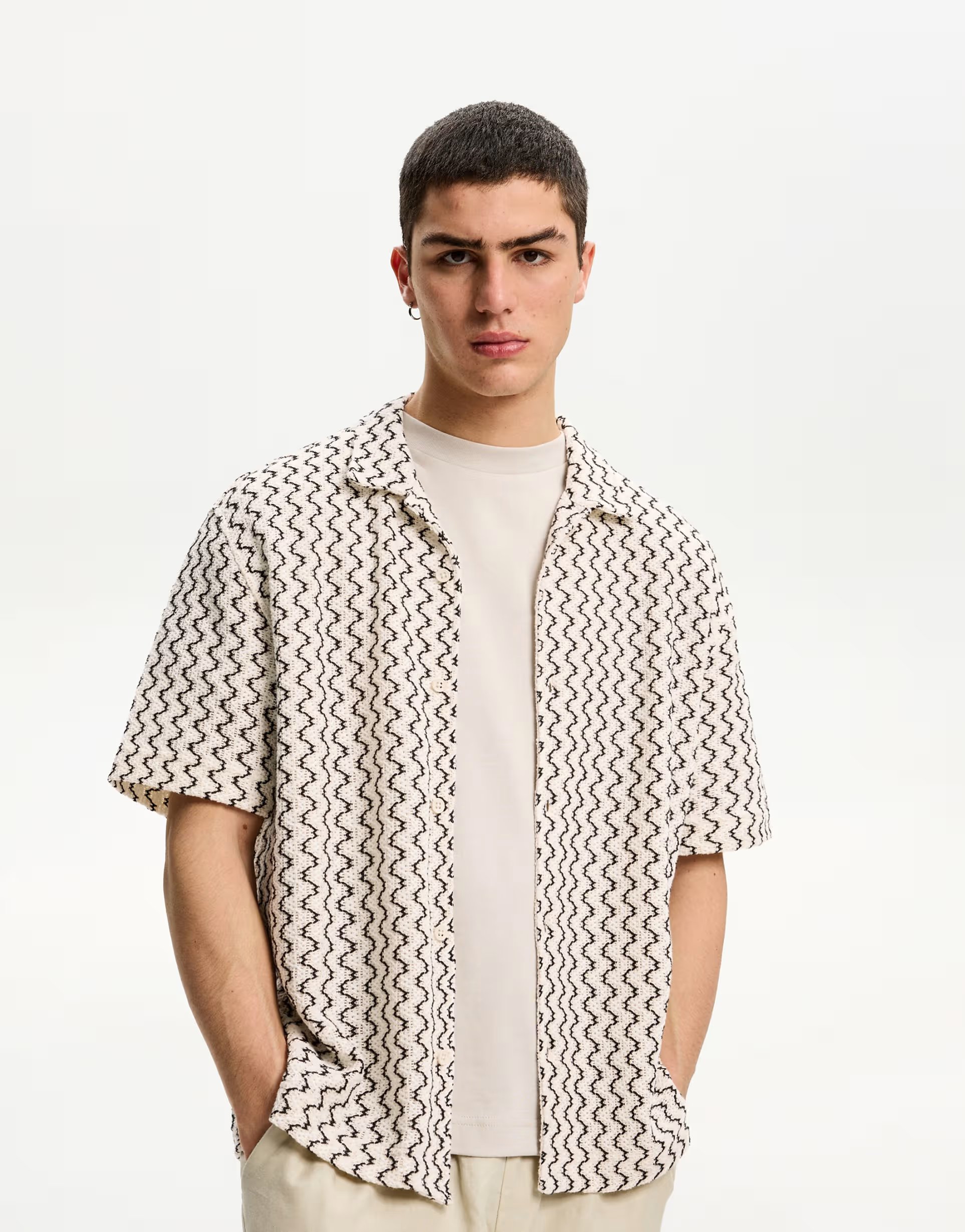The Bershka short sleeve rustic shirt in white features a casual yet stylish design perfect for everyday wear. Crafted from a comfortable fabric, it boasts a relaxed fit and a button-front closure.