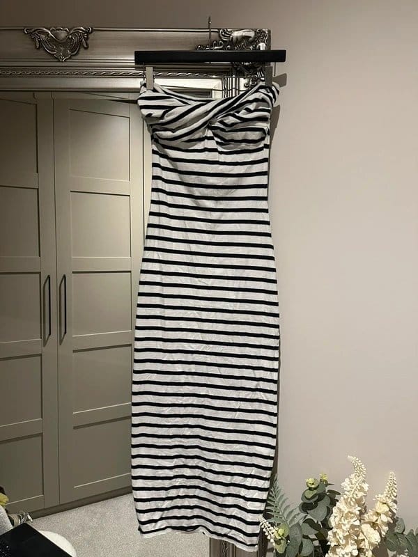 The ASOS Black and White Striped Strapless Maxi Dress is available in sizes S.