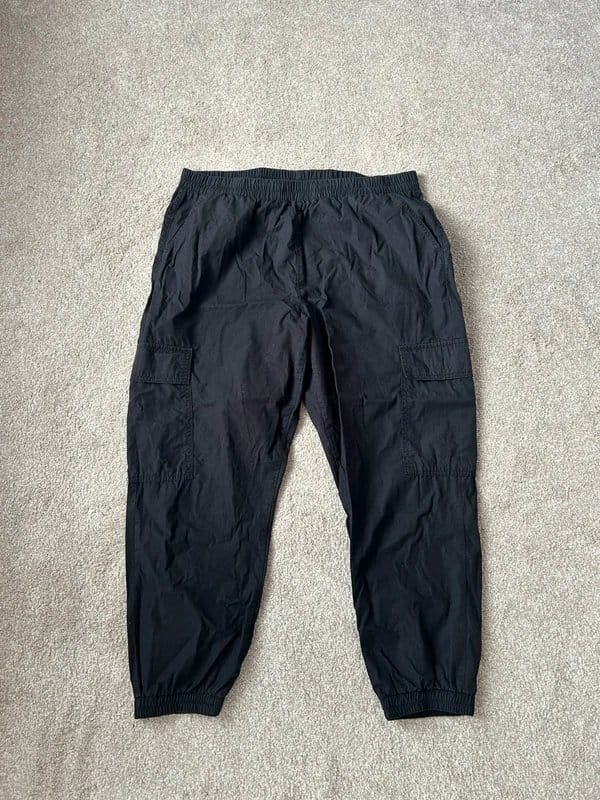 Stylish black cargo pants by ASOS, featuring an elasticated waist and cuffs for a comfortable fit. Designed with multiple pockets for practicality, these pants are perfect for casual outings.