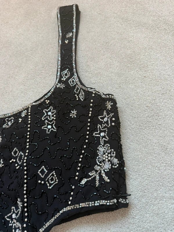 Stunning ASOS size 10 black structured corset-style crop top featuring intricate silver bead and sequin embellishments in star and geometric patterns. Thick straps and a flattering curved hem create a sculpted, vintage-inspired silhouette. Perfect for parties, festivals, evenings out or styling with high-waisted trousers or skirts.
