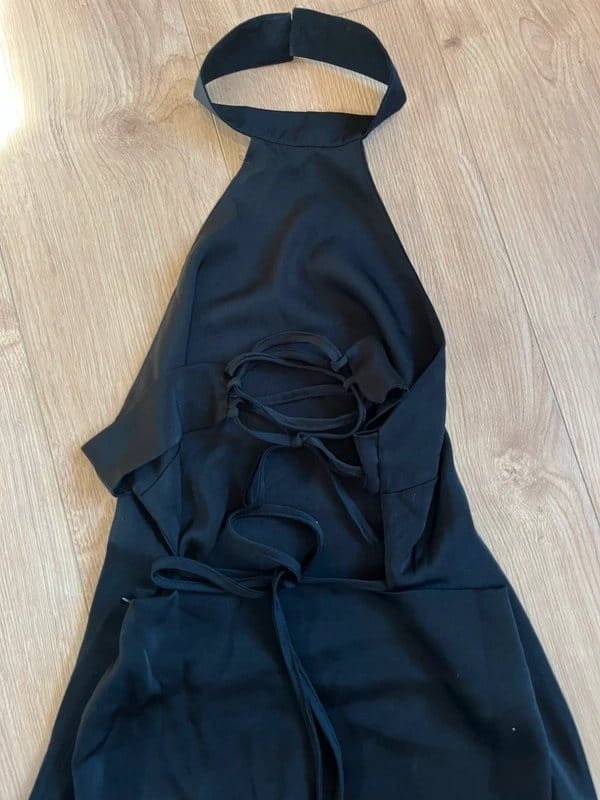 This black midi dress features a halter neck with a strappy back, perfect for evening events. Its elegant design and sophisticated silhouette make it a standout piece.