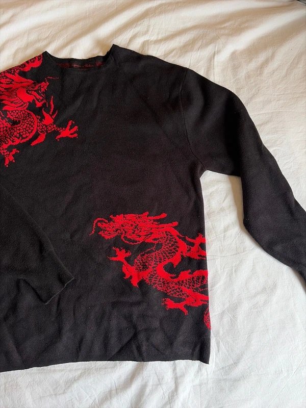 This black knitted jumper from ASOS features a dramatic red dragon print, making it a statement piece. The round neckline and long sleeves ensure a comfortable fit, while the oversized silhouette adds a modern touch.