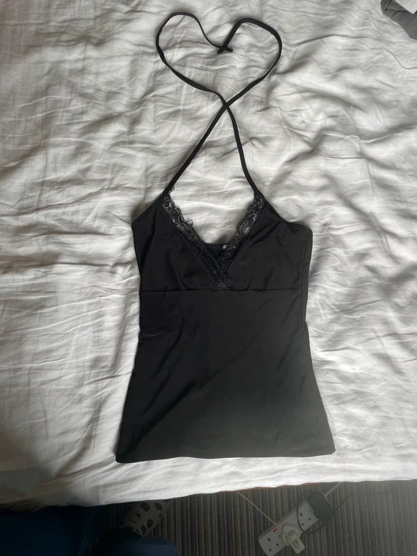 The Black lace halter neck cami top by ASOS is perfect for adding a touch of elegance to your outfit. With its lace detailing and sheer fabric, this piece is ideal for parties and special occasions.