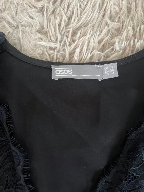 Stylish black lace top from ASOS featuring a V-neckline and lace detailing. The cinched waist adds a flattering silhouette. Perfect for a casual chic look.