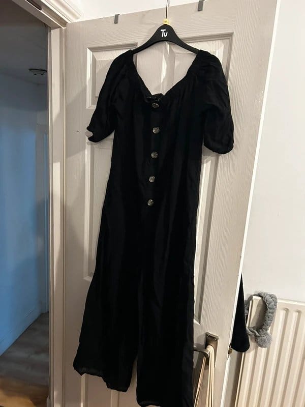 Stylish ASOS black playsuit with off-shoulder straps and a button-front design. Made from soft fabric for a comfortable fit. Ideal for casual outings or evening events.