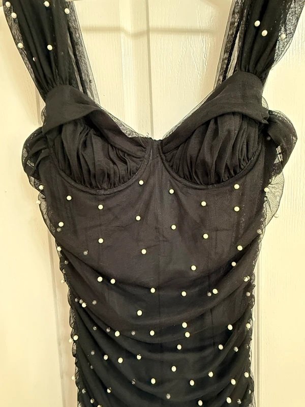 Elegant black ruched pearl midi dress from ASOS. Perfect for special occasions, this dress features intricate pearl detailing and a flattering silhouette.