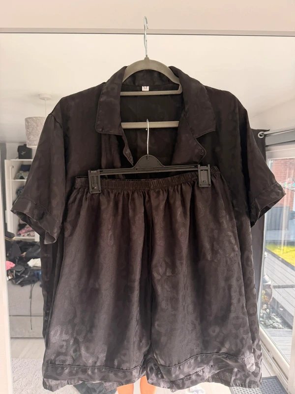 The ASOS Black Satin Pyjama Set with Short Sleeves is available in sizes M.