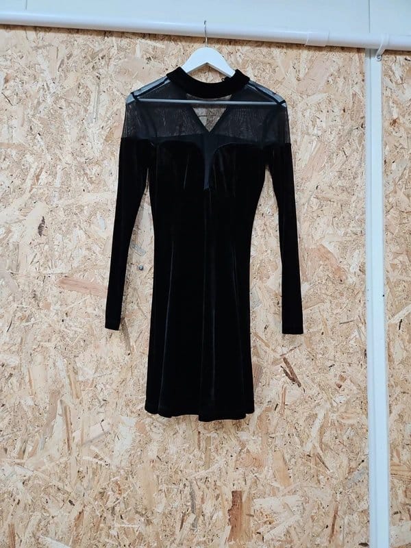 Stylish black velvet bodycon dress by ASOS. Features a sheer mesh panel on the front, long sleeves, and a high neckline. Perfect for evening events or date nights.