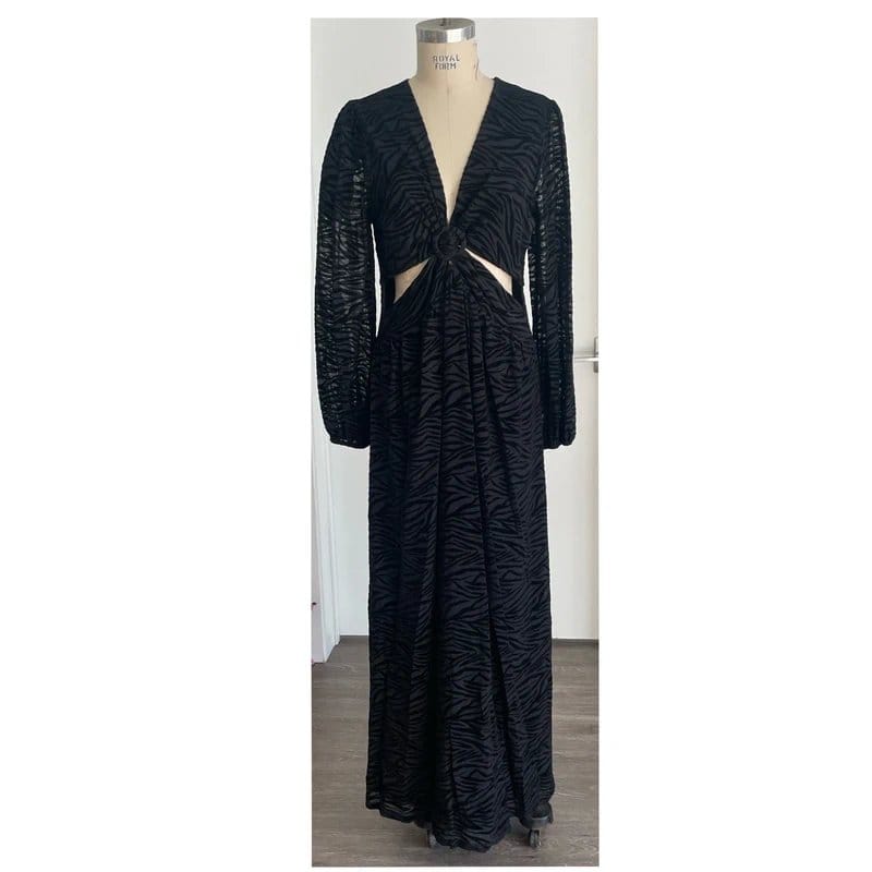 Striking black velvet zebra print maxi dress featuring a deep V-neckline, balloon sleeves, and a center back zipper. The O-ring at the center front adds a unique shirring detail. Fully lined for comfort, this dress is perfect for evening events.