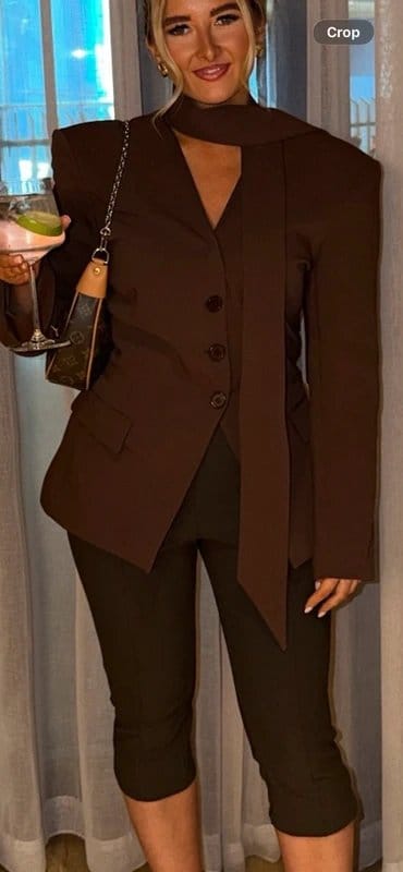 Stylish brown blazer with an attached scarf from ASOS. The blazer features a crop top design and buttoned front for a chic look. Ideal for casual and work settings.