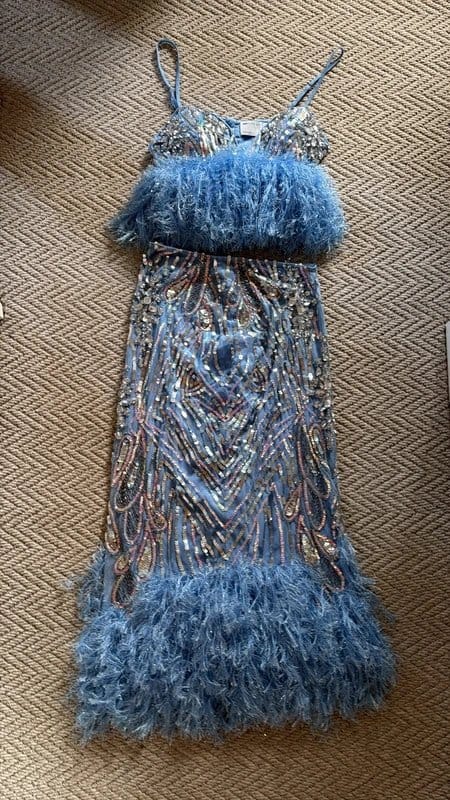 This light blue embellished sequin bralet and skirt co-ord set from ASOS is a stunning party piece. The bralet features a halter neck and sequin embellishments, while the skirt has a high-waist and flared hem with matching sequins and feathers.
