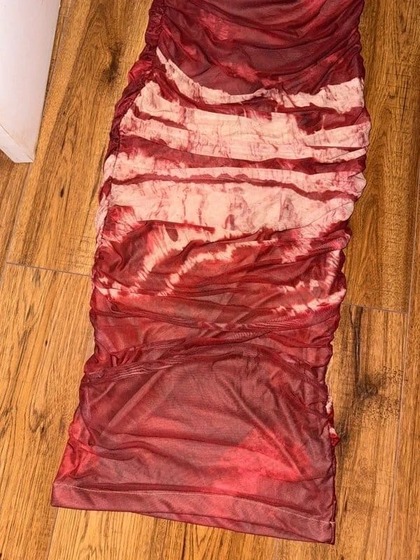 The ASOS Burgundy & Beige Ruched Mesh Midi Dress is available in sizes M.