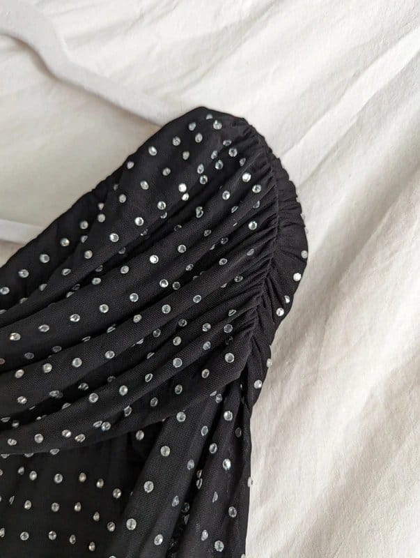 Stunning black rhinestone top from ASOS featuring a sparkling glitter effect and ruched neckline. Perfect for festival and rave events.