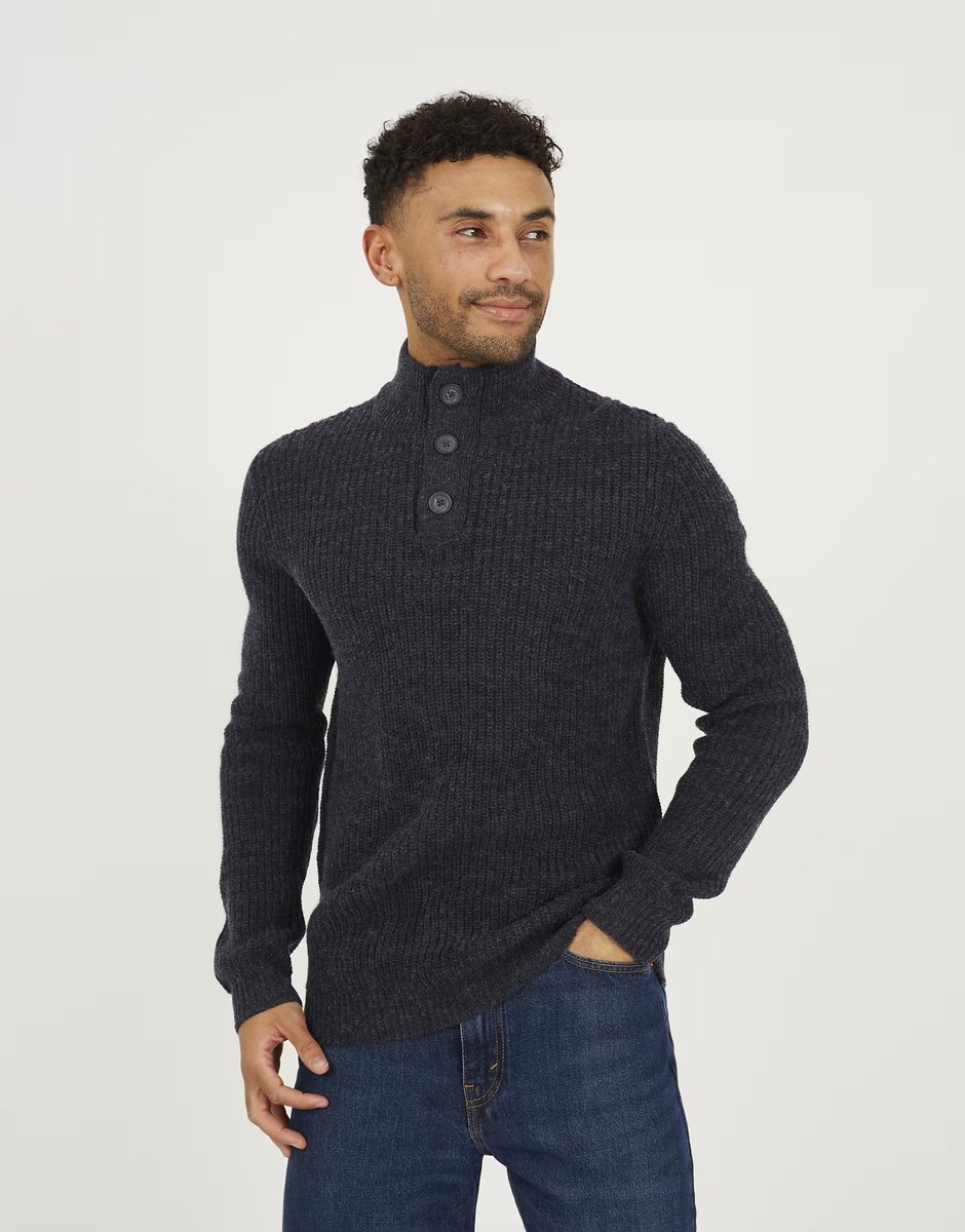 The navy funnel neck jumper is designed with a buttoned closure, offering a timeless fitted silhouette. Perfect for layering over shirts or under blazers, this piece is ideal for casual outings or smart-casual ensembles.