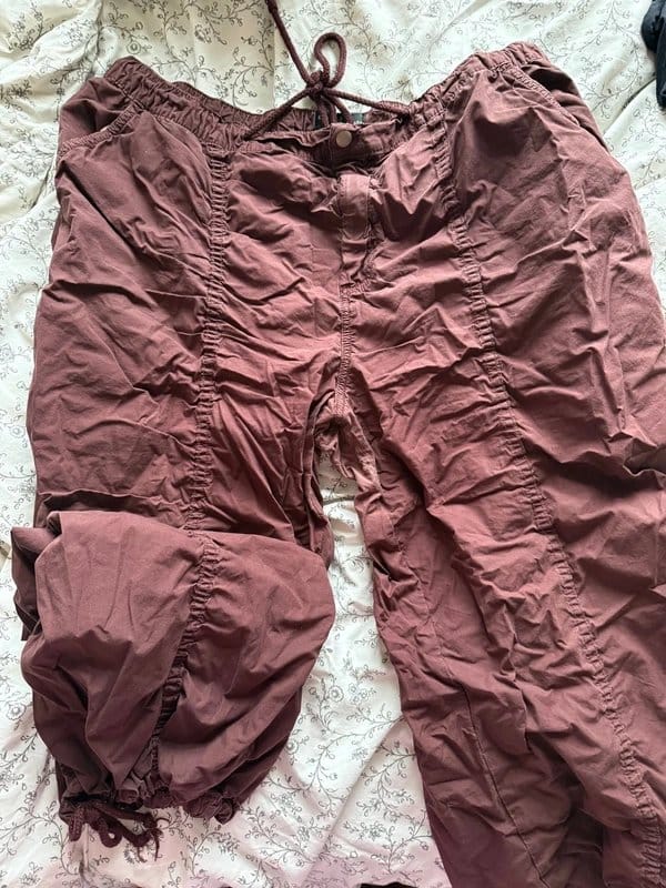 Stylish brown cargo pants by ASOS featuring a drawstring waist and adjustable ankle drawstrings. Made from durable fabric, perfect for a casual yet rugged look.