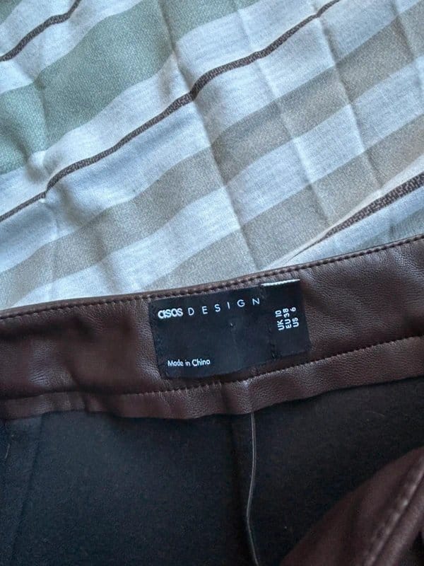 The ASOS Brown Leather Flared Jeans Size 10 is made from leather, denim.