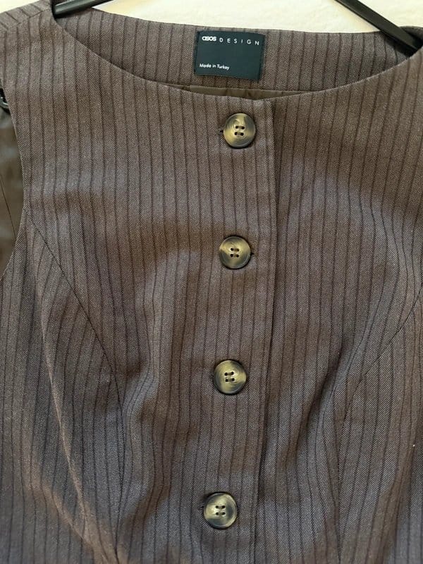 See all outfit ideasStylish ASOS sleeveless waistcoat in brown and black stripes. Made from a ribbed fabric, it features a button-through design for easy wear. Perfect for layering over tops or dresses.