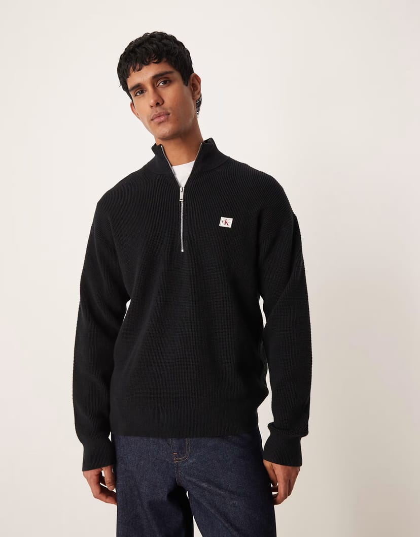 The ASOS Calvin Klein Jeans Quarter Zip Jumper in Black is made from cotton, polyester.