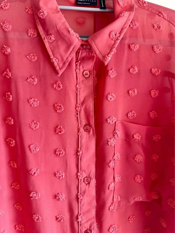 This coral chiffon blouse by ASOS features an oversized fit with a floral embroidered detail throughout. Perfect for a casual yet chic look.