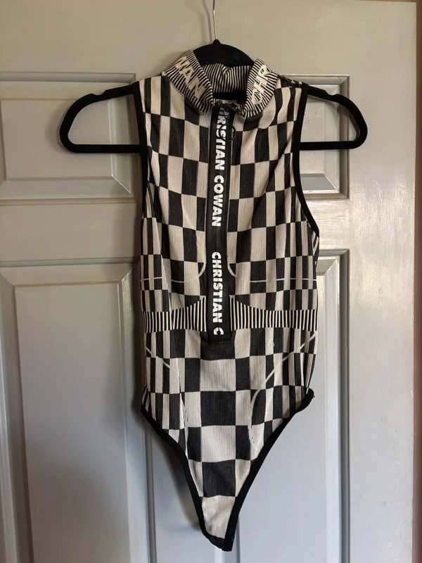 The ASOS Christian Cowan x Plaid Bodysuit in Black and Grey is available in sizes XXXL, XXL, XL, XS, L, M, S.
