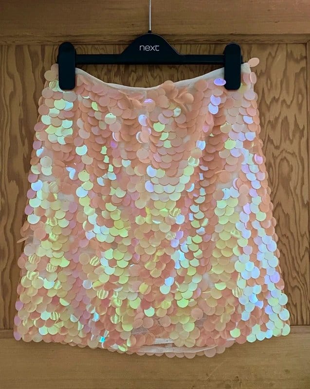 Festive Apricot sequin mini skirt from ASOS. This sparkly skirt features a full circle of shimmering sequins in various pastel shades, perfect for a Christmas party.