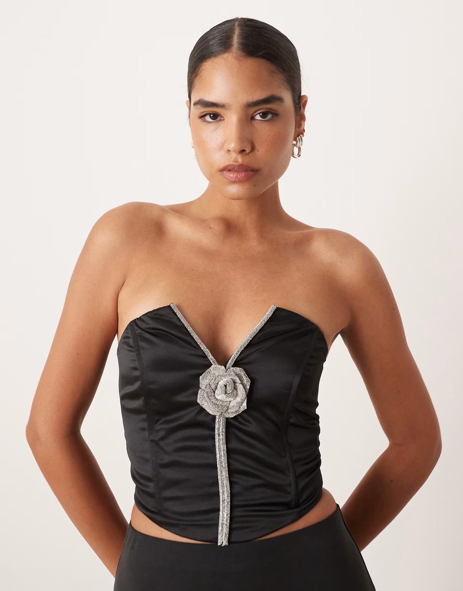 The ASOS Diamante Corsage Corset Top in Black Satin is ideal for party, evening, date-night.
