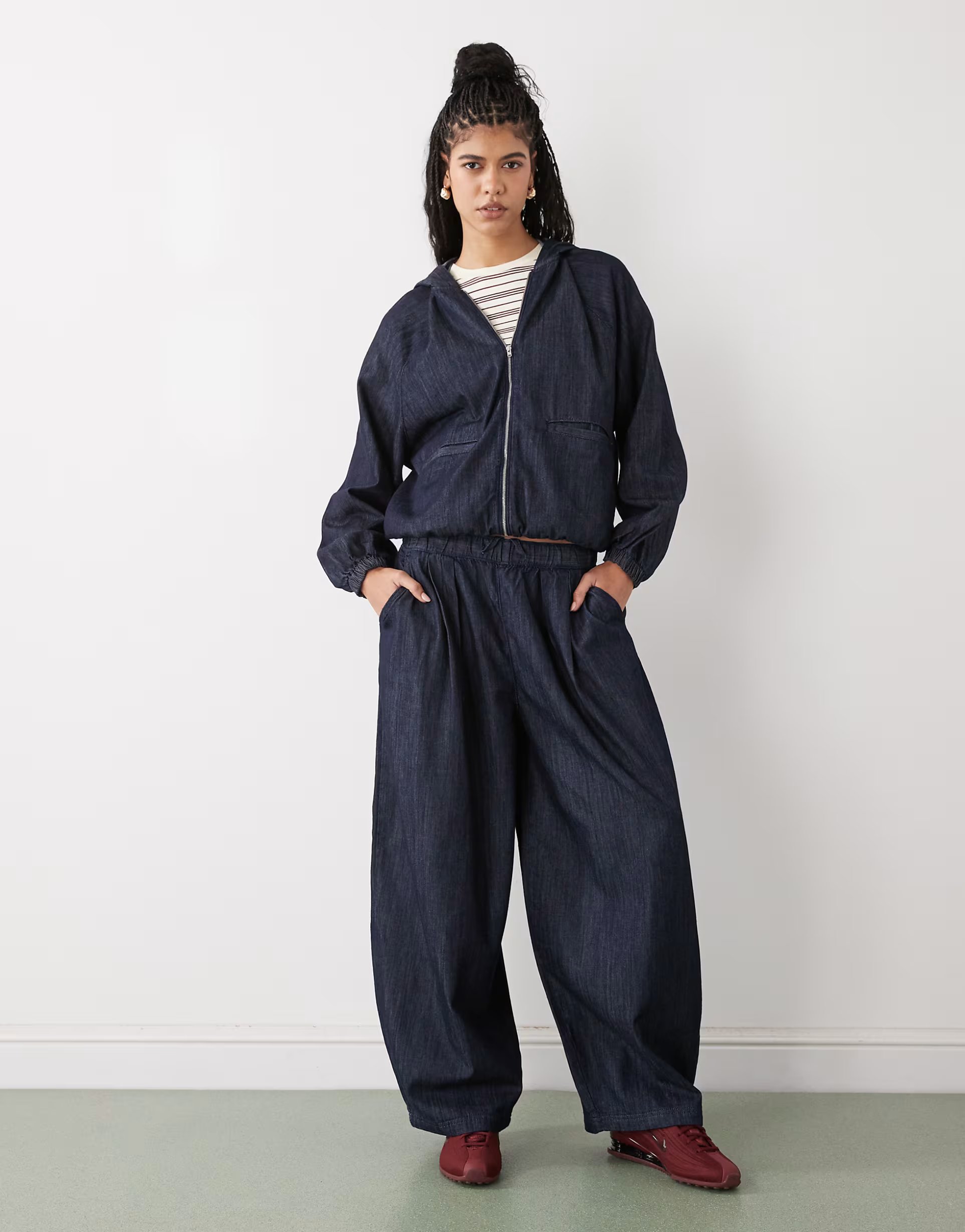 This denim co-ord features a chambray fabric, full-length sleeves, and a zipper closure. Pair it with red trainers for a casual look.