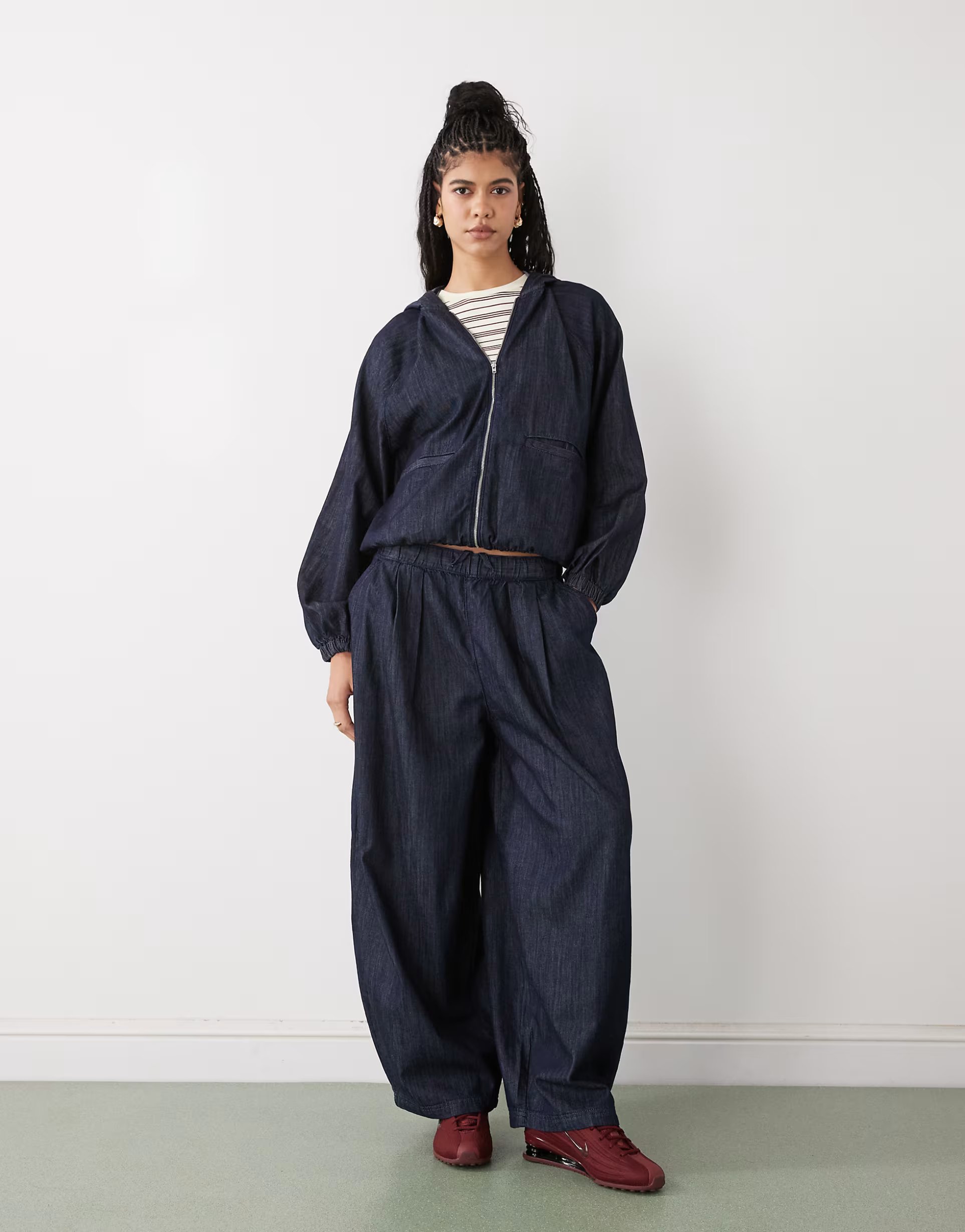 Crafted with a hooded denim track jacket and XL balloon jeans, this co-ord set is perfect for a casual day out. The jacket features a zip closure and is made from denim, while the jeans have an oversized fit and a high waist.