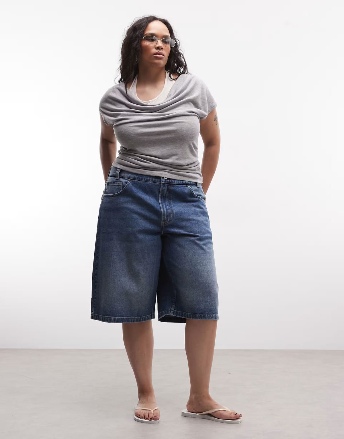 The ASOS COLLUSION Plus Skate Jort in Midwash is available in sizes XXXL, XXL, XL, XS, L, M, S.