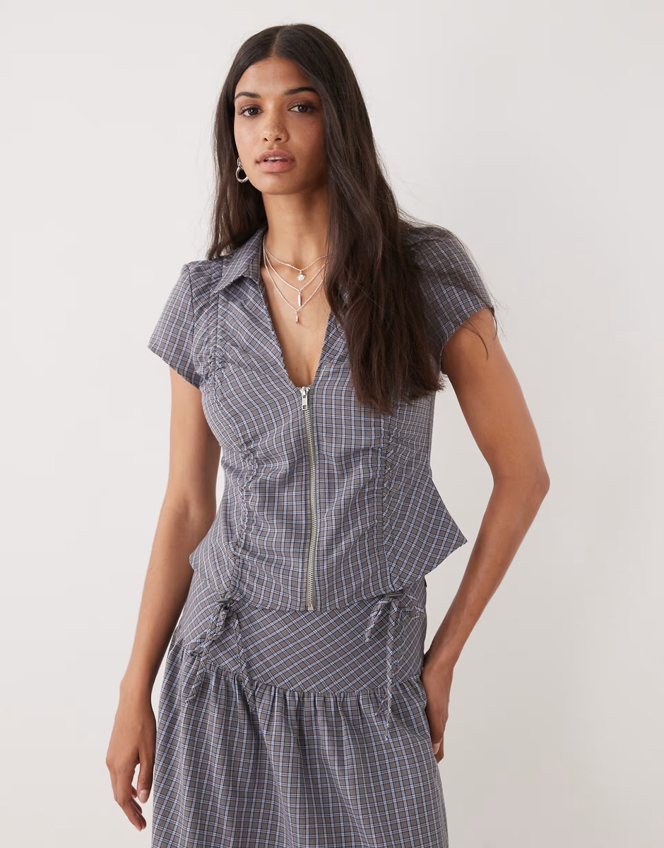 Crafted with a blue check pattern, this ruched fitted shirt features a zip closure and short sleeves. Ideal for casual outings.