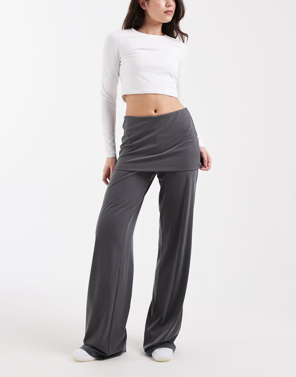 Stylish charcoal honey skirt overlay trousers by ASOS. Featuring a honey skirt overlay with a sheer effect, paired with wide-leg trousers for a modern look. Perfect for casual outings or smart-casual events.