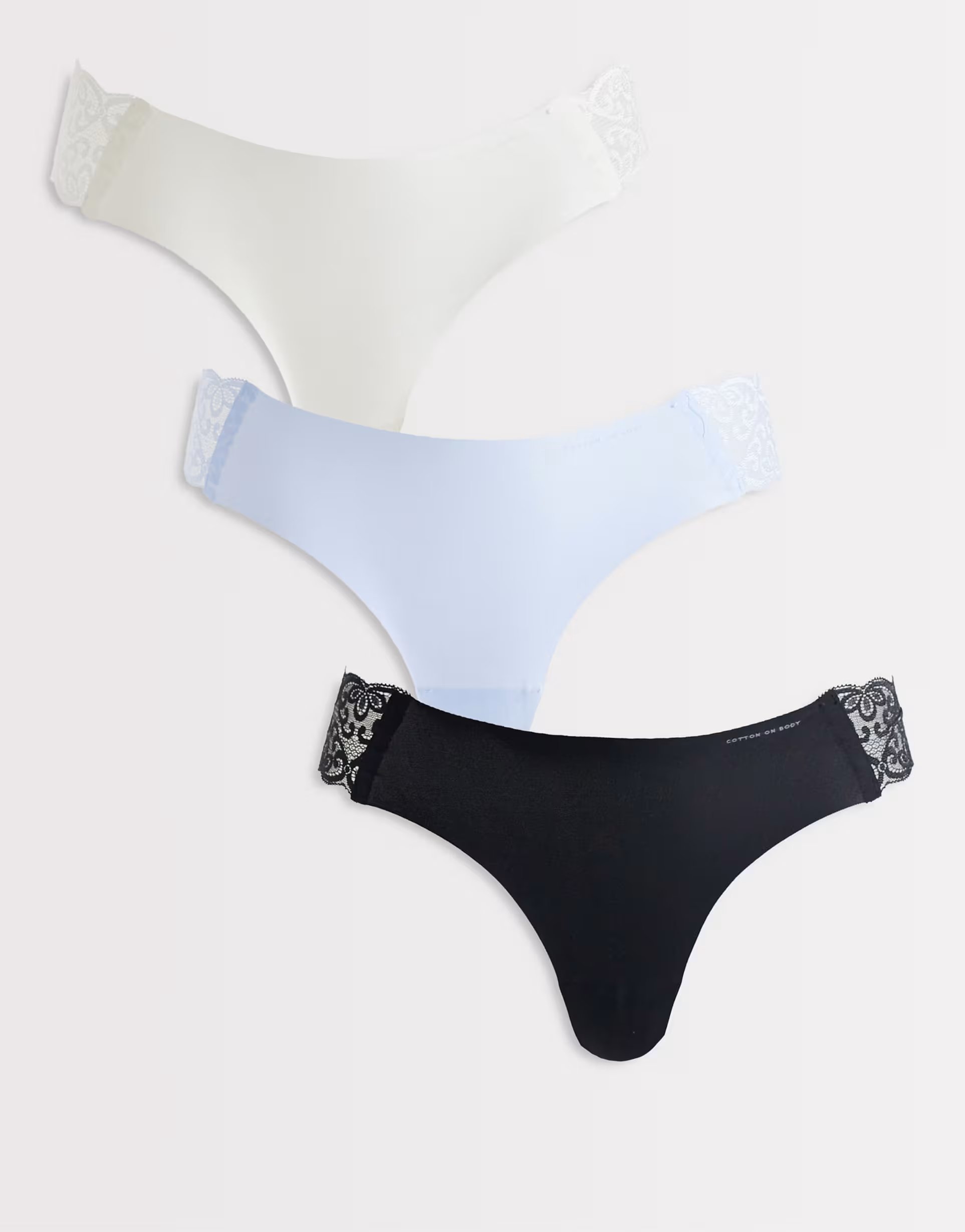 Stylish multi-colour seamless thongs from ASOS. Featuring a smooth, stretchy fabric with delicate lace trims, these thongs are perfect for everyday wear or special occasions.