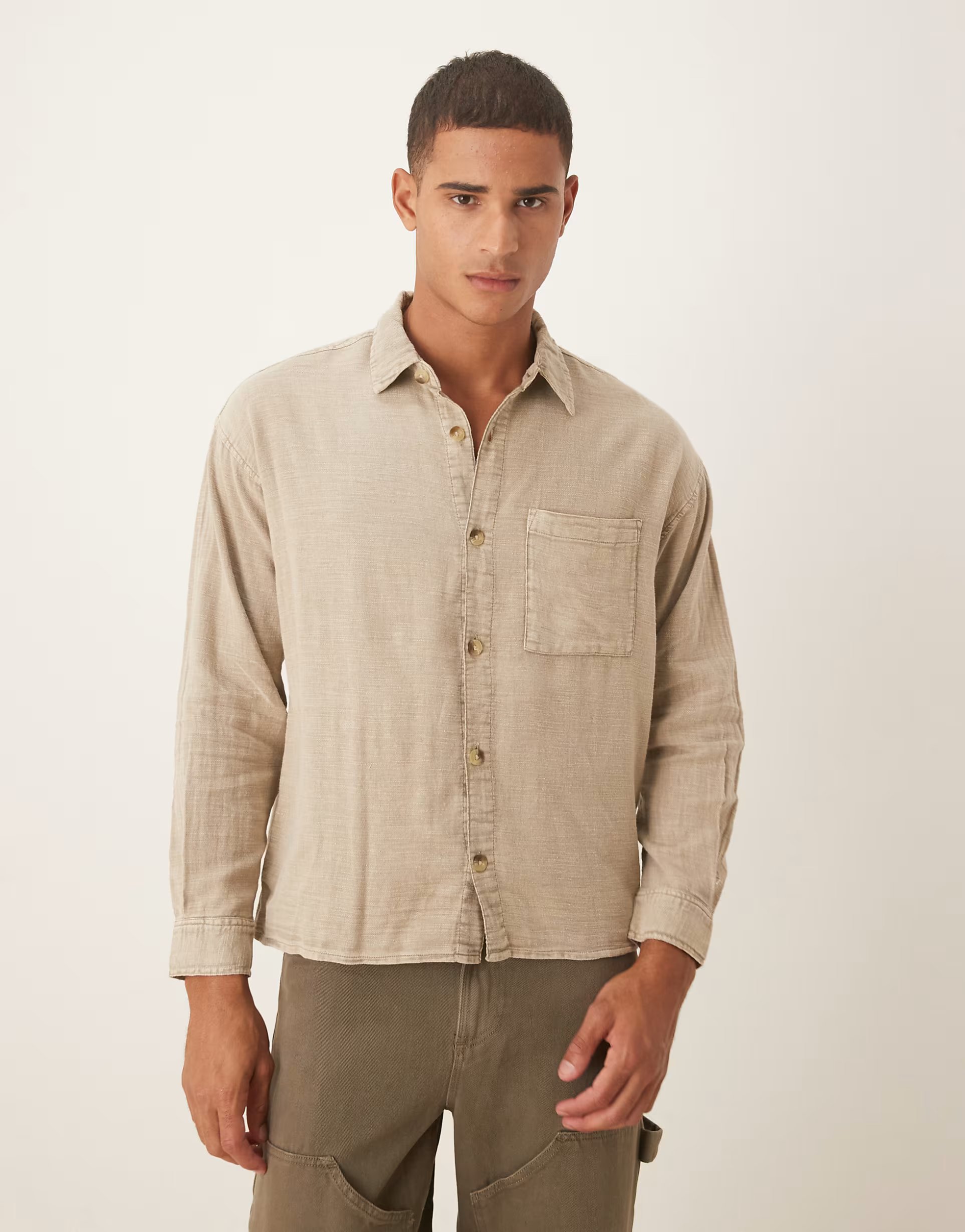 This beige long sleeve shirt from ASOS's Cotton On collection features a classic, washed finish. Ideal for layering, it adds a casual touch to any outfit.