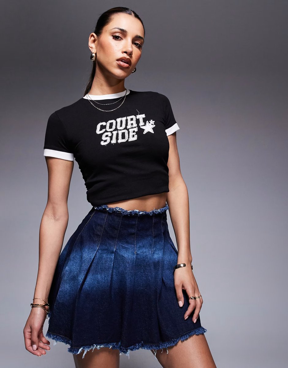 This Courtside pleated denim mini skirt with stone wash detail in blue rinse offers a fresh take on denim fashion. Perfect for casual outings, it features a mini length and a pleated design, adding a dynamic touch to your wardrobe.