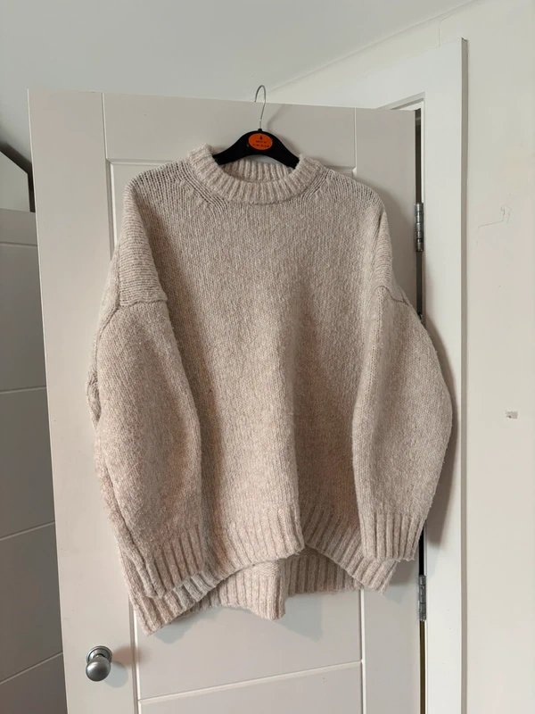 This oversized jumper is knitted with cream and beige hues, perfect for a cozy and stylish look. Its relaxed fit and warm material make it ideal for layering over casual wear.