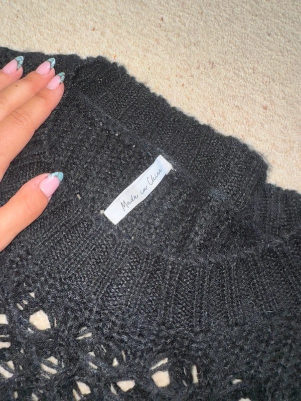 Stylish cropped jumper in black featuring a knitted texture with lace-like detailing. Perfect for layering over casual outfits.