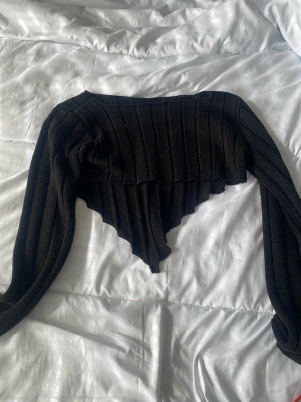 Stylish cropped jumper in black featuring a ribbed texture and asymmetrical hemline. Perfect for casual outings or layering over other garments.